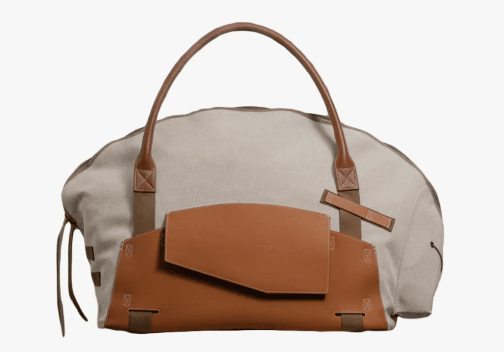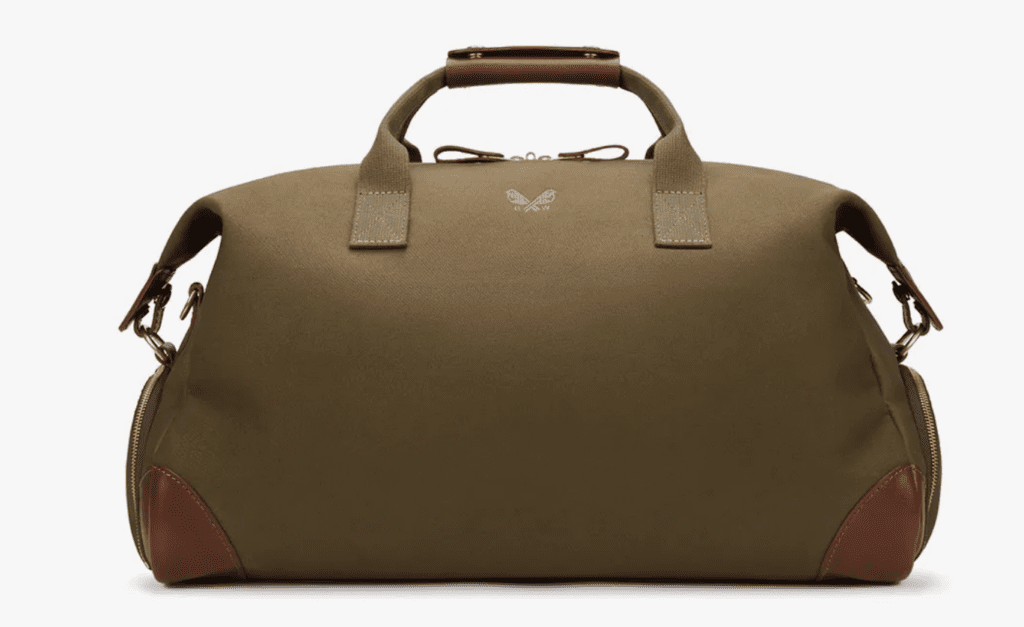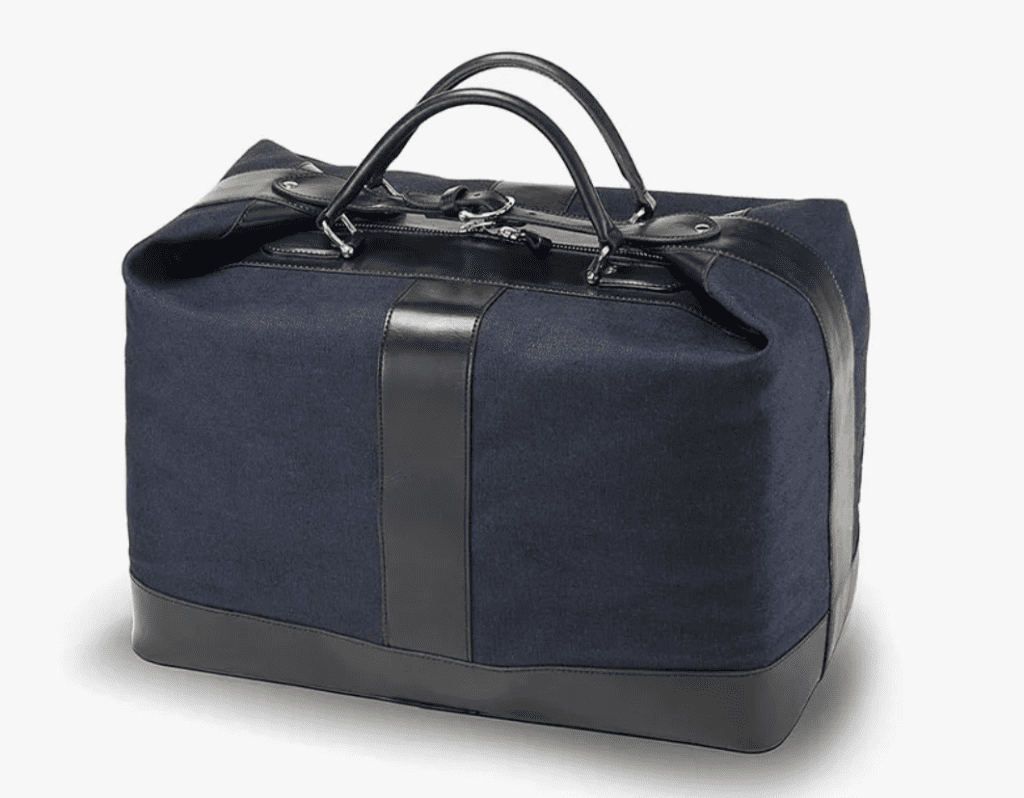 Its compact weekender, constructed from bonded Italian canvas for water-resistance and held with top handles secured by a sturdy leather hand strap, is no exception.