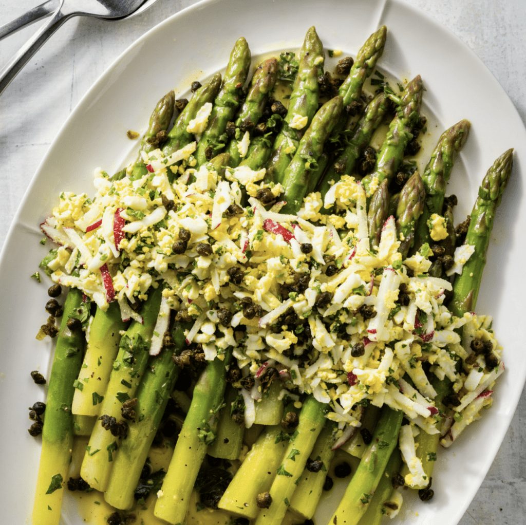 Asparagus Mimosa with Crispy Capers – With crisp-tender spears, plenty of fresh herbs, bright vinaigrette, and a shower of grated eggs, asparagus mimosa is France’s ode to the season.