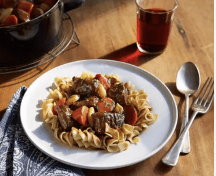 The dish is finished with a beurre manié — a mixture of equal parts butter and flour — that gets whisked into the stew at the end of cooking to create a smooth, thickened sauce.
