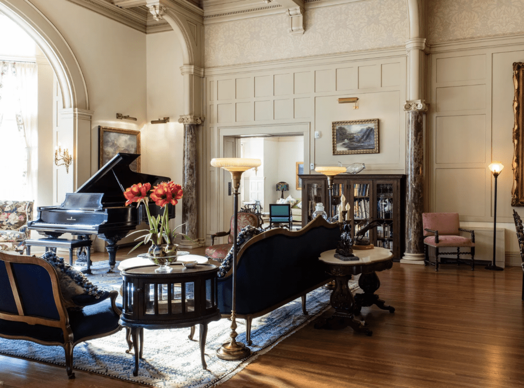 The grandeur of the mansion hearkens back to this era, from the marble-pillared great room’s dining room table outfitted in china and crystal to the grand piano.