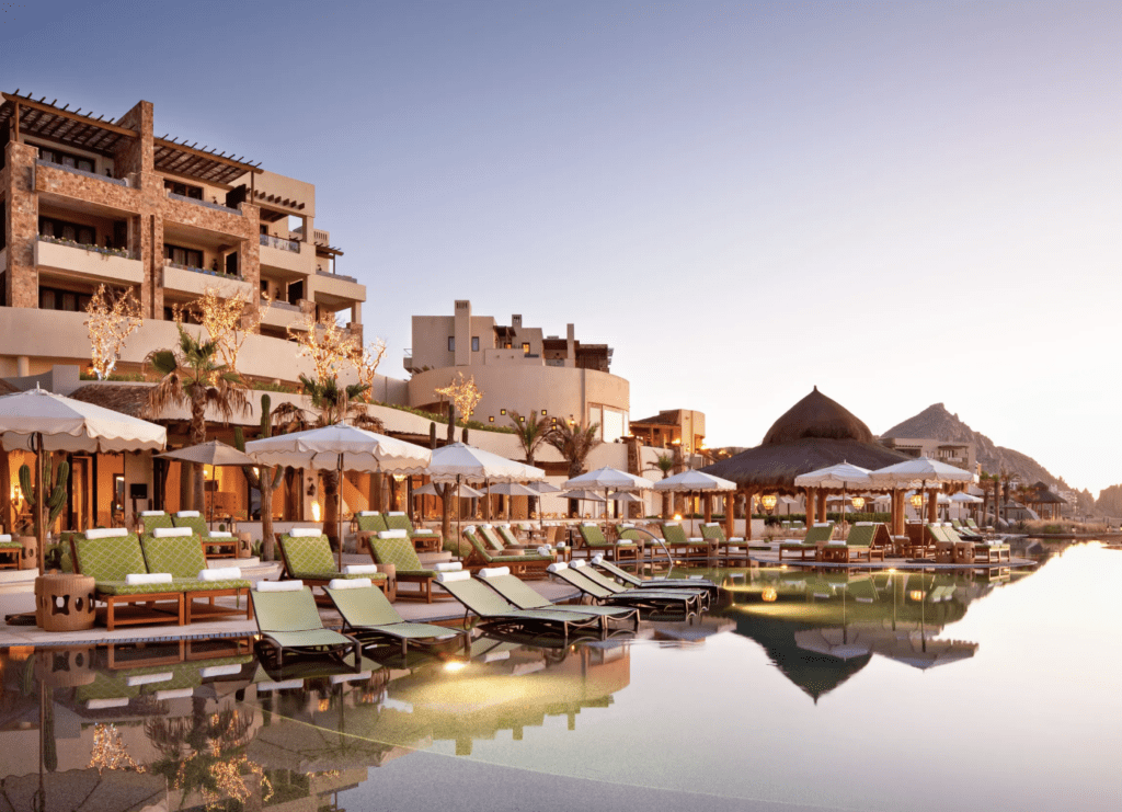 Enveloped by short, craggy hills on 24 pristine acres of Baja California beachfront, the upscale spot is practically floating in open waters, and in fact, it’s tricky to distinguish the hotel’s infinity pool from the brilliant blue body of water behind it.